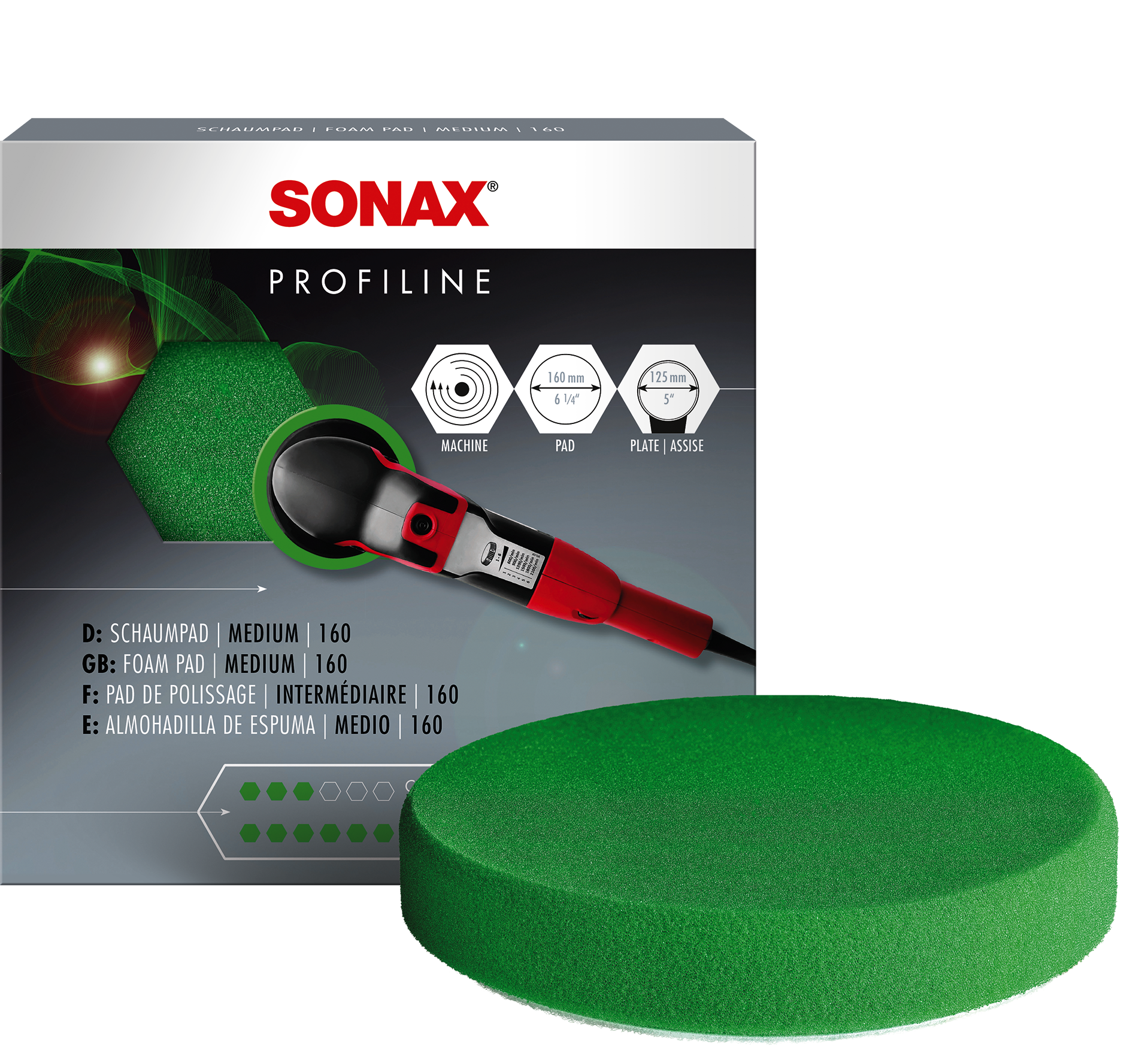 Medium harde fijnmazige polijstpad voor het machinaal polijsten van lakoppervlakken met SONAX Polijstmiddelen. Door klittenbandsluiting snel en eenvoudig te verwisselen. Diameter 160 mm.